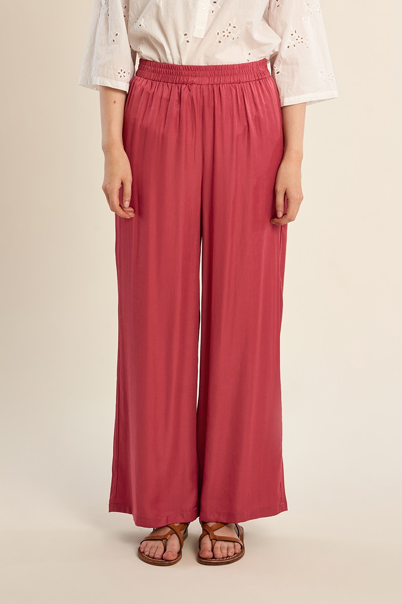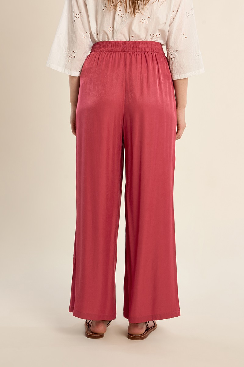 Pantalón largo, de tiro alto y cintura elástica. Modelo de perneras anchas, con pliegues